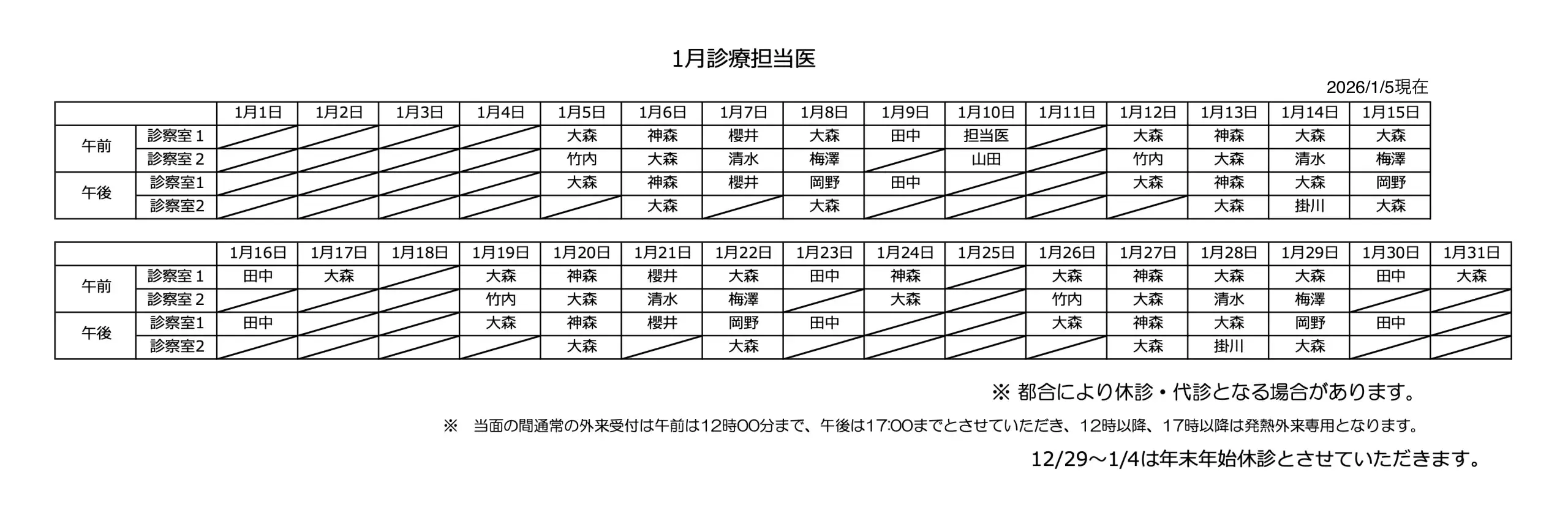 2026年1月診療担当医表