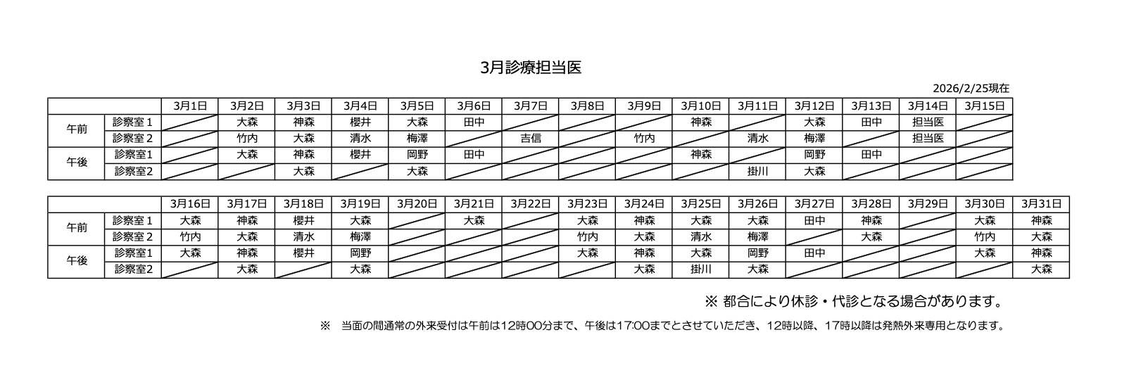 2026年3月診療担当医表
